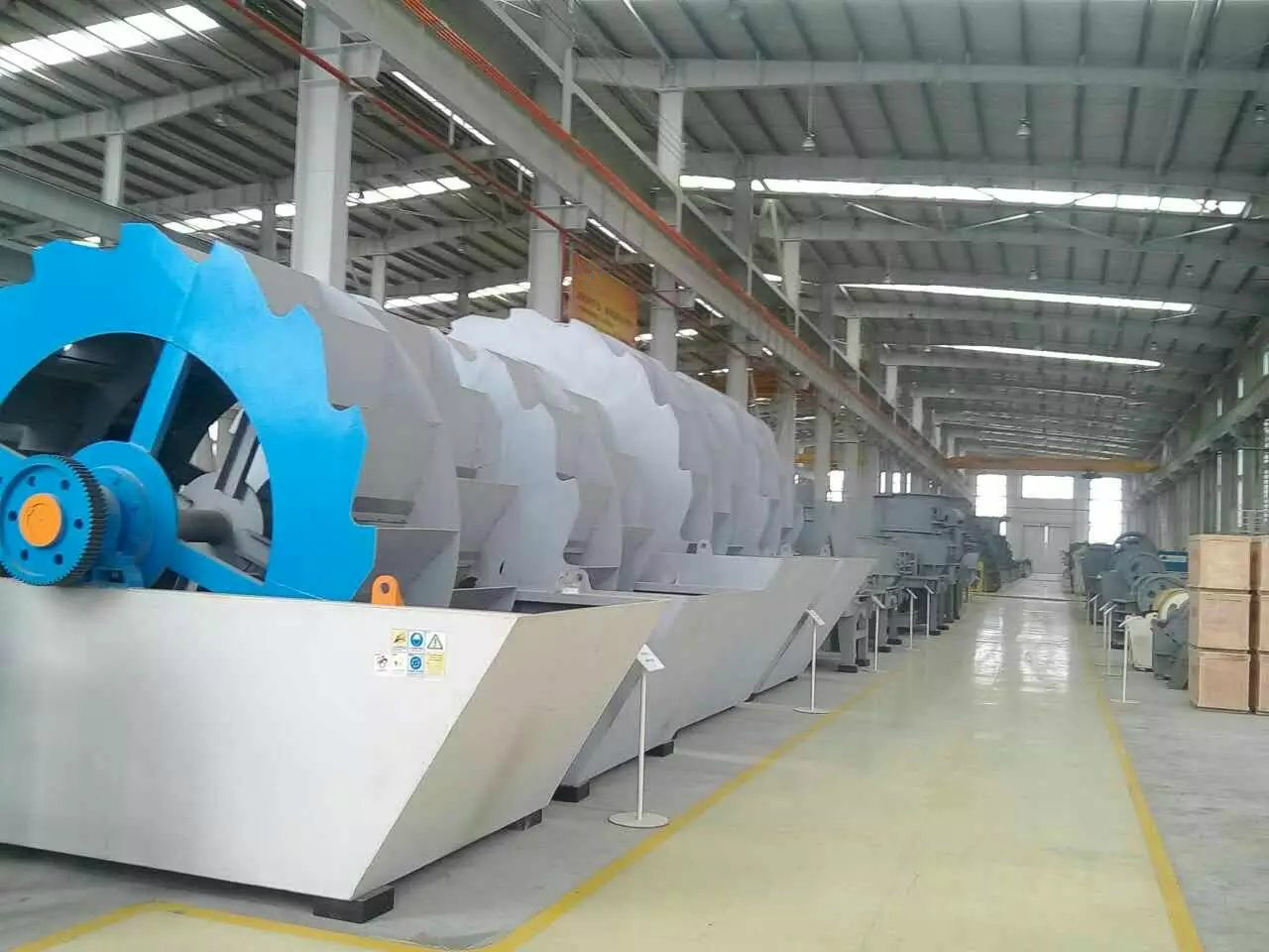 洗砂机工作时,电机通过三角带、减速机、齿轮减速后带动叶轮缓慢转动,砂石有给料槽进入洗槽中,在叶轮的带动下翻滚,并互相研磨,除去覆